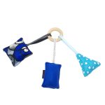 Attached to the teething ring are three different shapes made from bright cotton and lace material featuring a squeaker and many ways for the baby to explore textures, sounds, colours, and shapes.