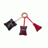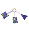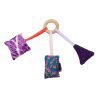 Attached to the teething ring are three different shapes made from bright cotton and lace material featuring a squeaker and many ways for the baby to explore textures, sounds, colours, and shapes.